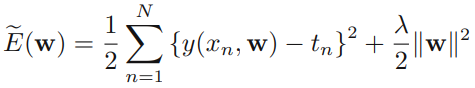 \(||w||^{2} = w^{T}w = w_{0}^{2}+w_{1}^{2}+...+w_{M}^{2}\) 이며 \(\lambda\)로 정규화항의 상대적 중요도를 설정한다. 타깃 변수의 원점이 무엇이냐에 따라 결과가 바뀌는 것을 막기 위해 \(w_{0}\)을 정규화항에서 제외하기도 하고 별도의 항을 만들기도 한다.