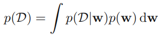 데이터 관측 전 \(w\)에 대한 우리의 가정을 사전 확률 분포 \(p(w)\)로 표현할 수 있고 관측된 데이터 \(D=\{t_{1},...,t_{N}\}\)은 조건부 확률 \(p(D|w)\)로 작용하게 된다. \(D\)를 관측한 후 \(w\)에 대한 불확실성을 사후 확률 \(p(w|D)\)로 표현할 것이다.