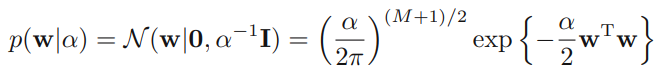 베이지안 방식을 적용하기 위해 다음과 같은 단순화된 형태의 다항 계수 \(\textbf{w}\)의 사전 분포(가우시안 분포)를 도입할 것이다.