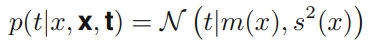 여기서 \(p(t|x,\mathbf{w})\)는 식 1.60에서 주어진 가능도 분포이며 \(p(w|\mathbf{x},\mathbf{t})\)는 식 1.66을 정규화하여 얻을 수 있는 매개변수에 대한 사후 분포이다.