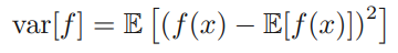 \(f(x)\)의 분산(variance)은 다음과 같이 정의된다. 분산은 \(f(x)\)가 평균값으로부터 얼마나 멀리 분포되어 있는지를 나타낸다. 분산의 식을 전개하여 \(f(x)\)와 \(f(x)^{2}\)의 기댓값으로 표현할 수 있다.