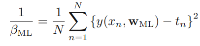 마찬가지로 \(\beta\)에 대해서 최대 가능도 함수를 구할 수 있다. 이는 \(\textbf{w}_{ML}\)을 먼저 구한 후 구할 수 있다.
