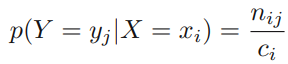 \(X=x_{i}\)인 사례들 중 \(Y=y_{j}\)인 사례들의 비율은 \(p(Y=y_{j}|X=x{i}\)로 나타낼 수 있고 이를 조건부 확률(conditional probability)라고 한다.