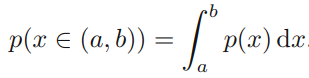 위에서는 이산적인 사건에 대한 확률을 알아보았고 이제 연속적인 변수의 확률을 알아볼 것이다. 변수 \(x\)가 \((x,x+\delta x\) 구간에서 값을 갖고 그 변수의 확률이 \(p(x)\delta x (\delta x \rightarrow 0)\)이라면, \(p(x)\)를 \(x\)의 확률 밀도(probability density)라 한다. 이 때 \(x\)가 \((a,b)\) 구간 사이의 값을 가질 확률은 아래와 같다.