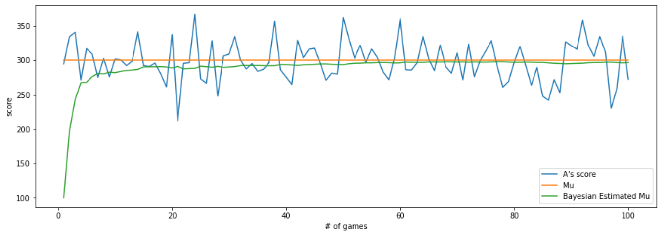 이렇게 게임 판수가 늘어날수록 Bayesian Inference를 통해 추정한 \(\mu\)(green line)이 실제 \(\mu\)(orange line)에 수렴하는 것을 확인할 수 있다.