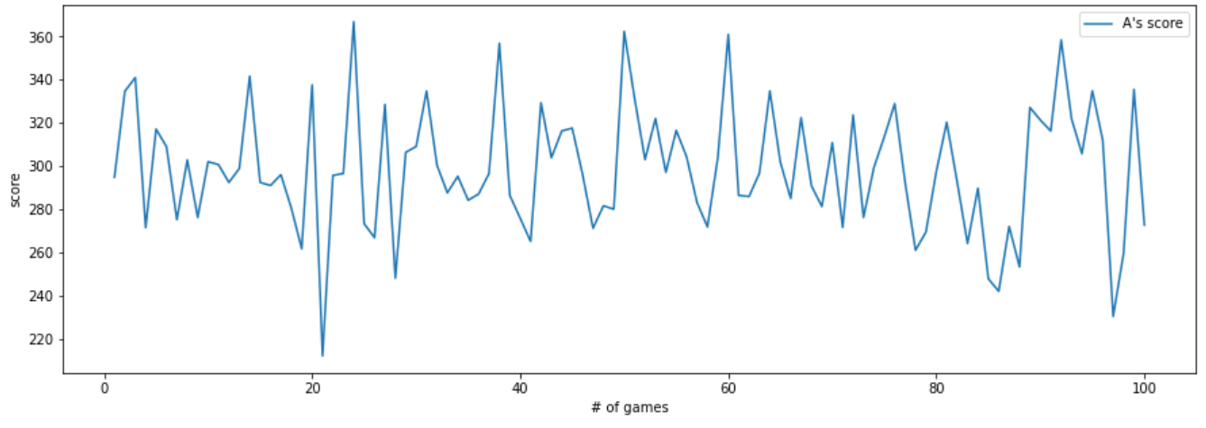 가상의 게임에서 유저 A의 실력 점수 분포가 \(N(300, 30)\)인 분포를 따를 때, 100판 동안 유저 A의 점수 Sequence는 아래 Plot과 같을 것이다.
