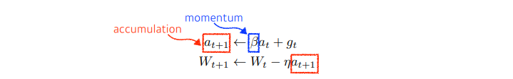 \( t \)시점의 Gradient(미분 값)인 \( g_t \)를 다음 시점인 \( t+1 \)시점에 버리고 \( g_{t+1} \)만 사용하는 것이 아니라 이전 시점과 현재 시점의 Gradient를 조합하여 만든 Accumulation Gradient (\( a_{t+1} \))을 사용하여 Gradient Descent를 진행합니다.